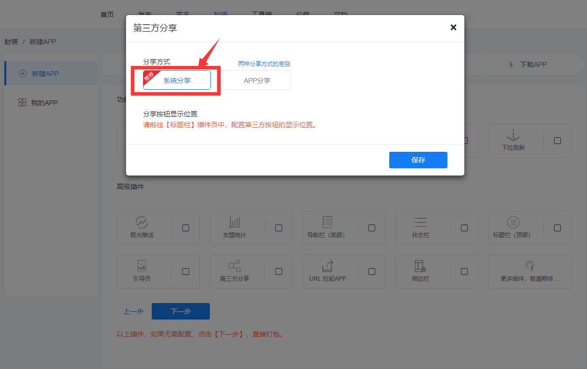 2. 申请到Key后,请在【封装-我的APP】中,点击编辑,在选择插件页,打开【第三方分享】的插件,输入Key值。